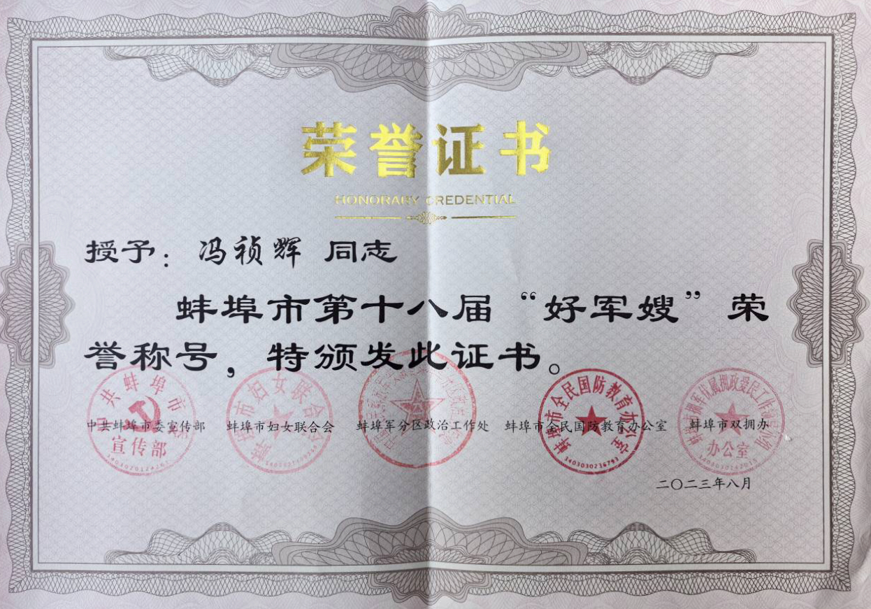 九州(中国)冯祯辉同志获得蚌埠市第十八届“好军嫂...