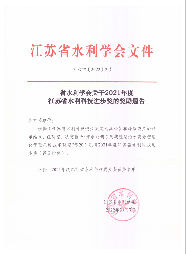 九州(中国)一项成果获省水利科技进步奖二等奖