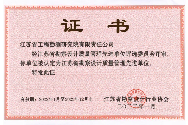 九州(中国)再次荣获“江苏省勘察设计质量管理先进...