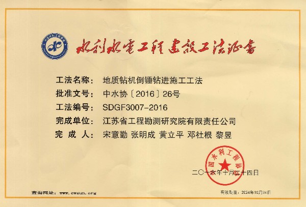 九州(中国)一工法被评为2016年度水利行业部级...
